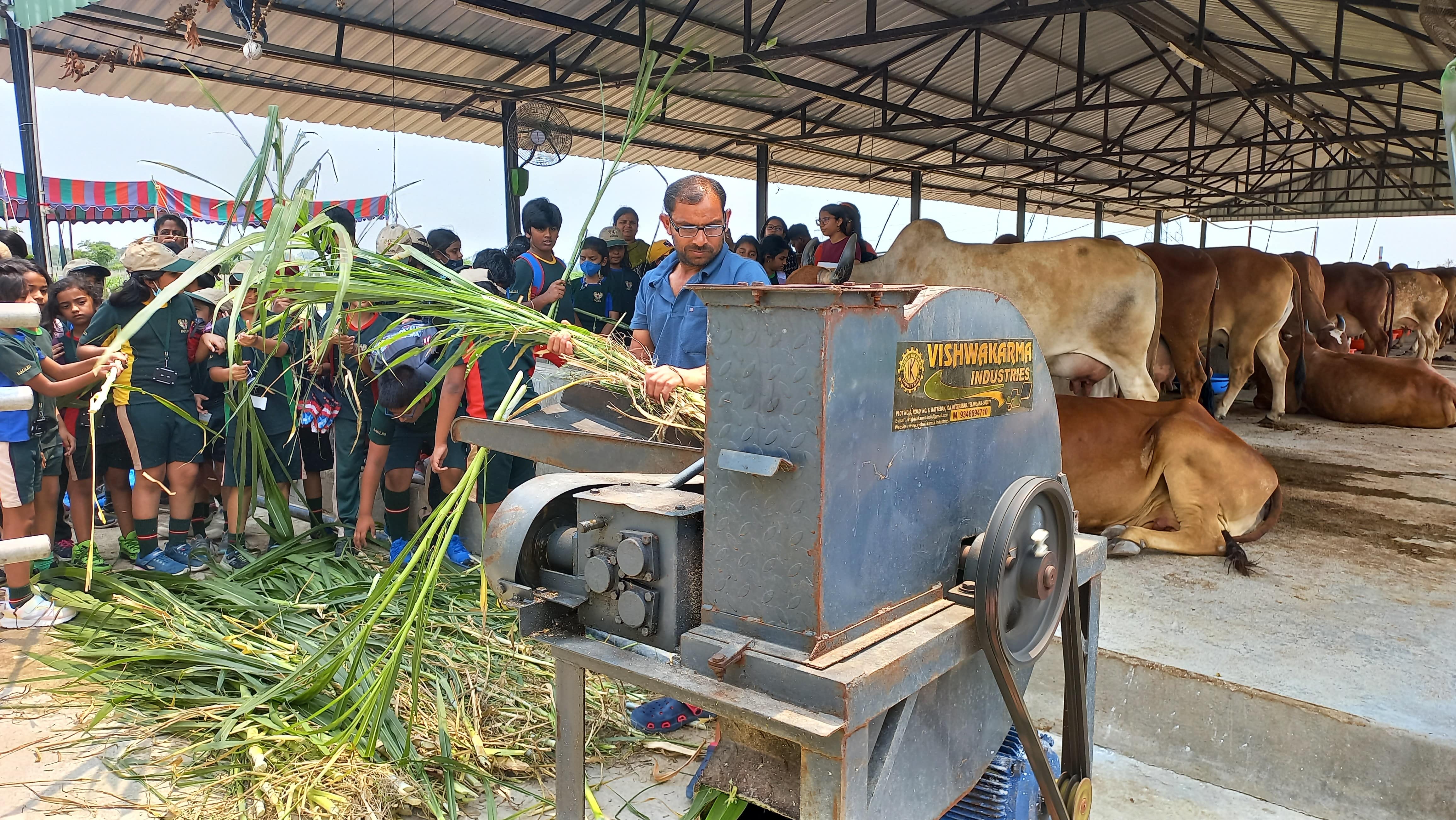Our supervisor Chotu demonstrated how the fodder chopping machine operates to the group.